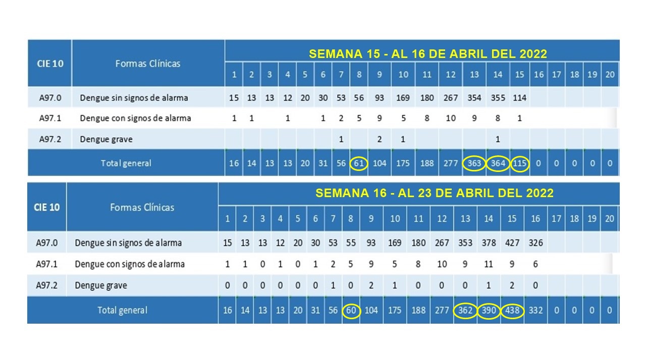 De acuerdo con la imagen en el boletín epidemiológico de la semana 15 se indica que se presentaron 115 casos, pero en el boletín de la semana 16 se informa que en dicha semana se presentaron 438 casos y las demás semanas epidemiológicas las cifras no concuerdan.