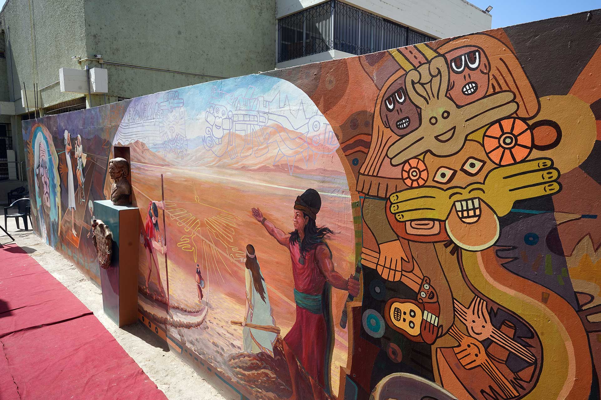 “En el mural se aprecia la imagen de María Reiche divisando el horizonte hacia las pampas de Nasca y también en diferentes etapas de su vida en que se dedicó a tiempo completo al estudio de los misteriosos geoglifos del desierto de Nasca”, manifestó el artista plástico.